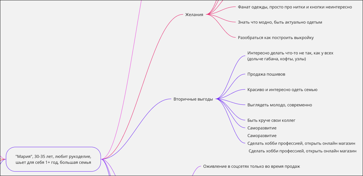 Для проведения кастдева мы попросили прошлых покупателей с нами созвониться. После общения в среднем по 40 минут мы собрали майндкарту с ключевыми смыслами для прогрева.